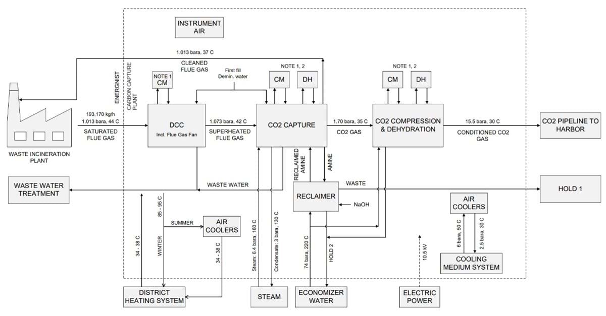 vis kvalitet (temperaturafhængigt) fra processen kan genanvendes til fjernvarme ved et godkendt projektforslag, mens luftkølere anvendes til at fjerne den resterende overskudsvarme fra systemet. Et reboiler dampsystem