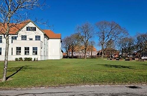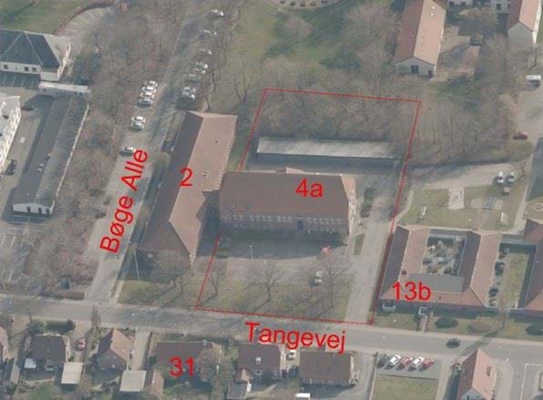 Bøge Allé 4b set fra syd mod nord. Det tidligere hospital og politistation ses i baggrunden, hvor den blå solafskærmning er trukket for.