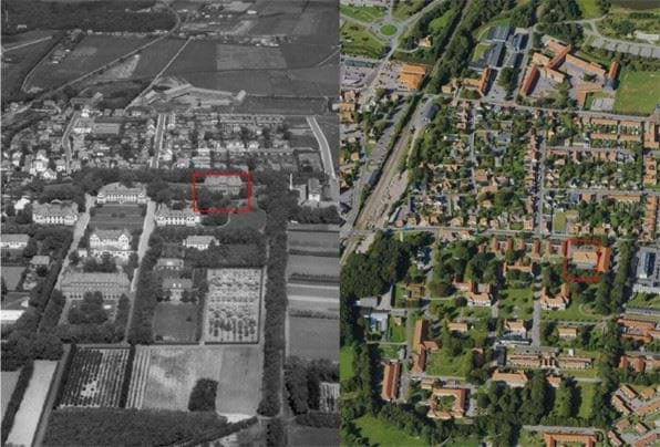 Billede TV: Ribelund omkring 1956, set fra syd mod nord. Sylvester Jensen luftfoto. Billede TH: Ribelund i 2021, set fra syd mod nord. SDFE