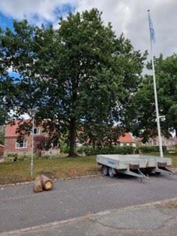 De store løvtræer skal bevares i det grønne areal mellem parkeringspladsen og Tangevej. Set fra parkeringspladsen mod Tangevej.