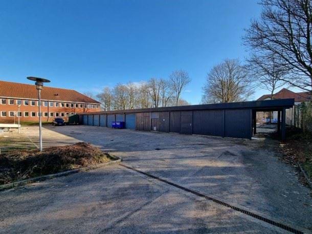 Garageanlægget syd for den bevaringsværdige bygning. Dele af anlægget forudsættes revet ned.