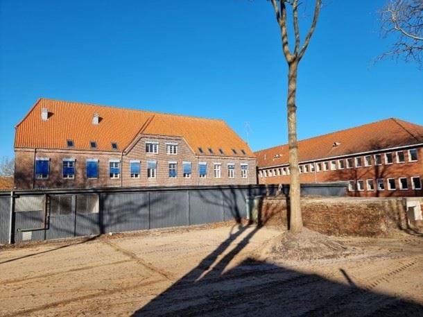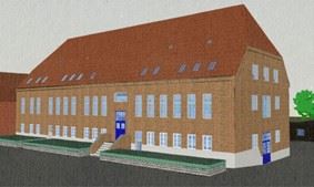 Bygningens nordvendte facade efter ombygning set fra nordvest. |