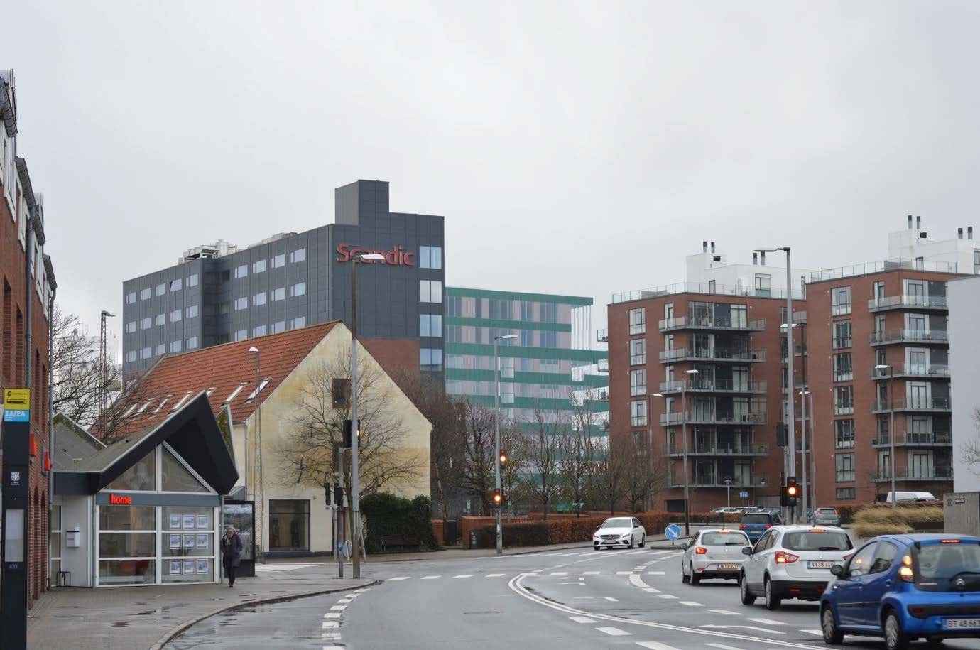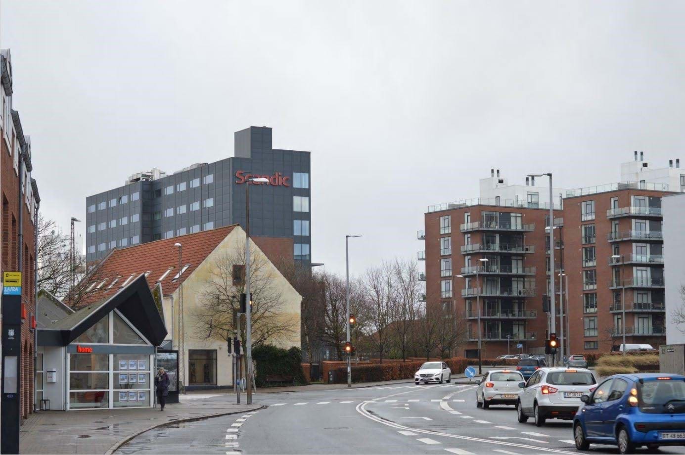 Herfra ser man et godt billede på, hvordan den planlagte bebyggelse kommer til at fungere som huludfyldning i et område med allerede eksisterende høj bebyggelse. Vest for den planlagte bebyggelse ses Hotel Scandic Esbjerg, og øst for ses de to naboetageboliger på Strandbygade 6-8. Selvom den planlagte bebyggelse vil være 4-5 meter højere end eksisterende bebyggelse i området, vurderes det kun at have en mindre væsentlig påvirkning af byrummet, da den lægger sig op ad eksisterende høj bebyggelse og ikke tager udsynet til noget.