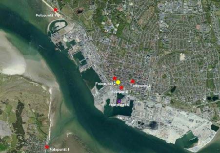 Figur 17 - Oversigtskortet viser de 6 fotostandpunkter, der er anvendt. Fotopunkt 1,5 og 6 refererer til kystnærhedszonen, mens fotopunkt 2, 3 og 4 anvendes senere i rapporten til vurdering af byrummet. Planområdet er vist med en gul prik.
