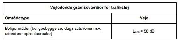 De vejledende grænseværdier for trafikstøj er beregnet til planlægningsbrug og gælder for udlægning af nye støjfølsomme områder langs eksisterende veje.