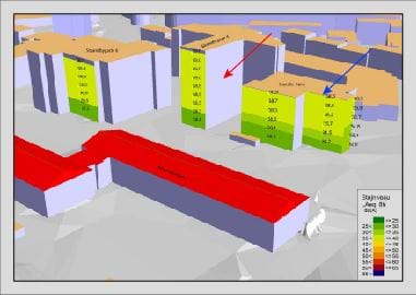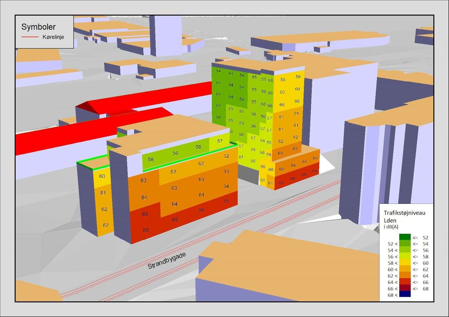 På billedet ses de nederste etager at være røde, hvilket betyder, at de ikke overholder Miljøstyrelsens grænseværdier for vejtrafikstøj.