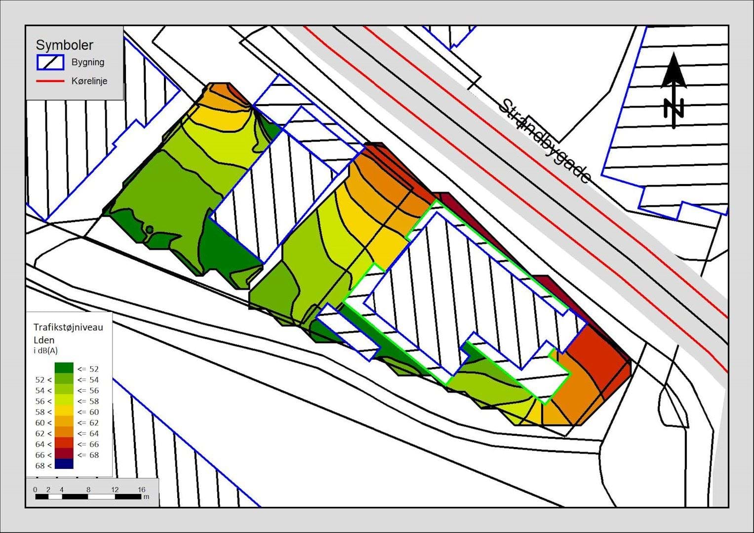 Figur 13 - Støjkonturkort 1,5 meter over terræn på tagterrasserne på Strandbygade 2.