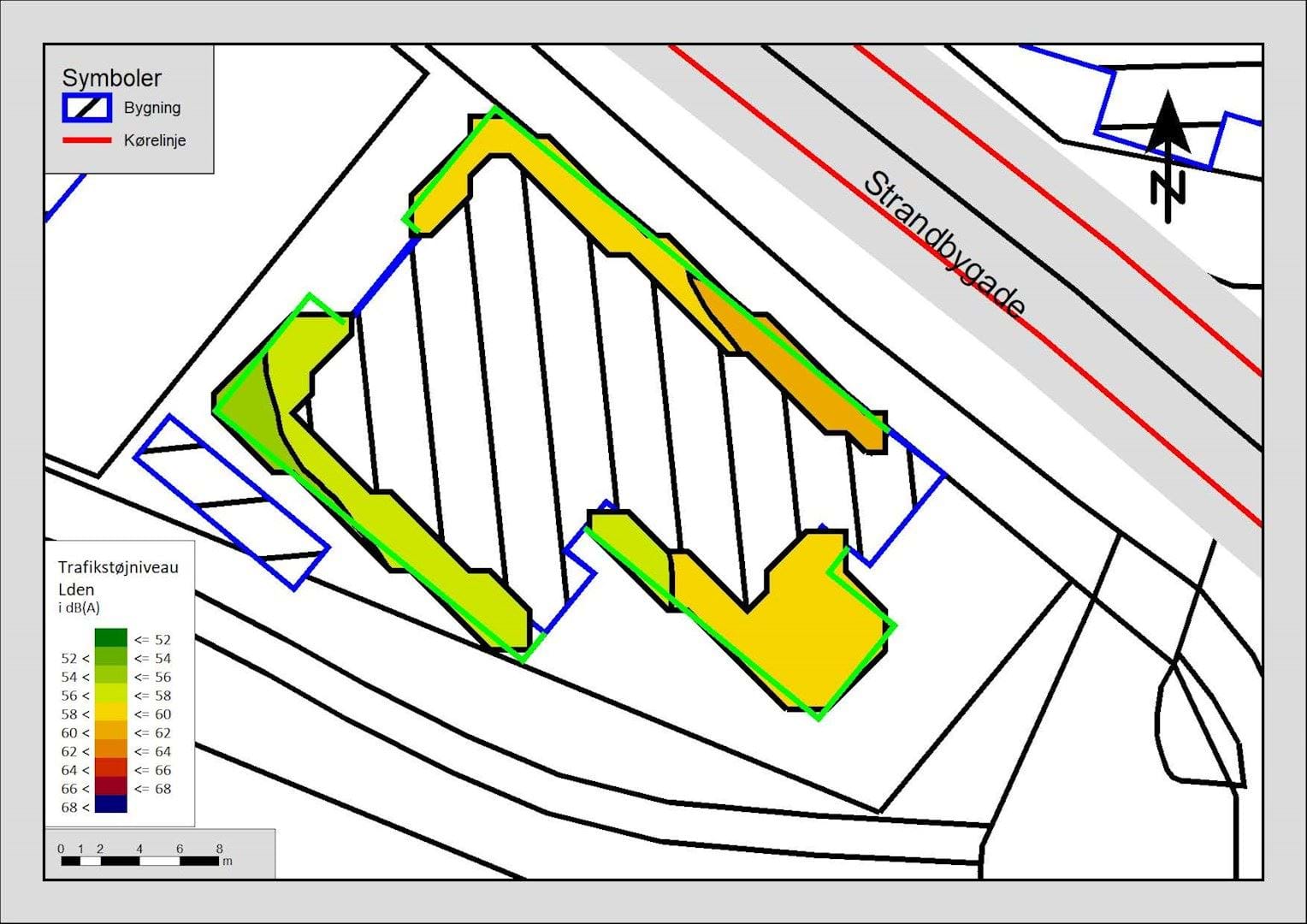Figur 12 - Støjkonturkort 1,5 meter over terræn på terrassen på Strandbygade 4 og på terræn på Strandbygade 2.