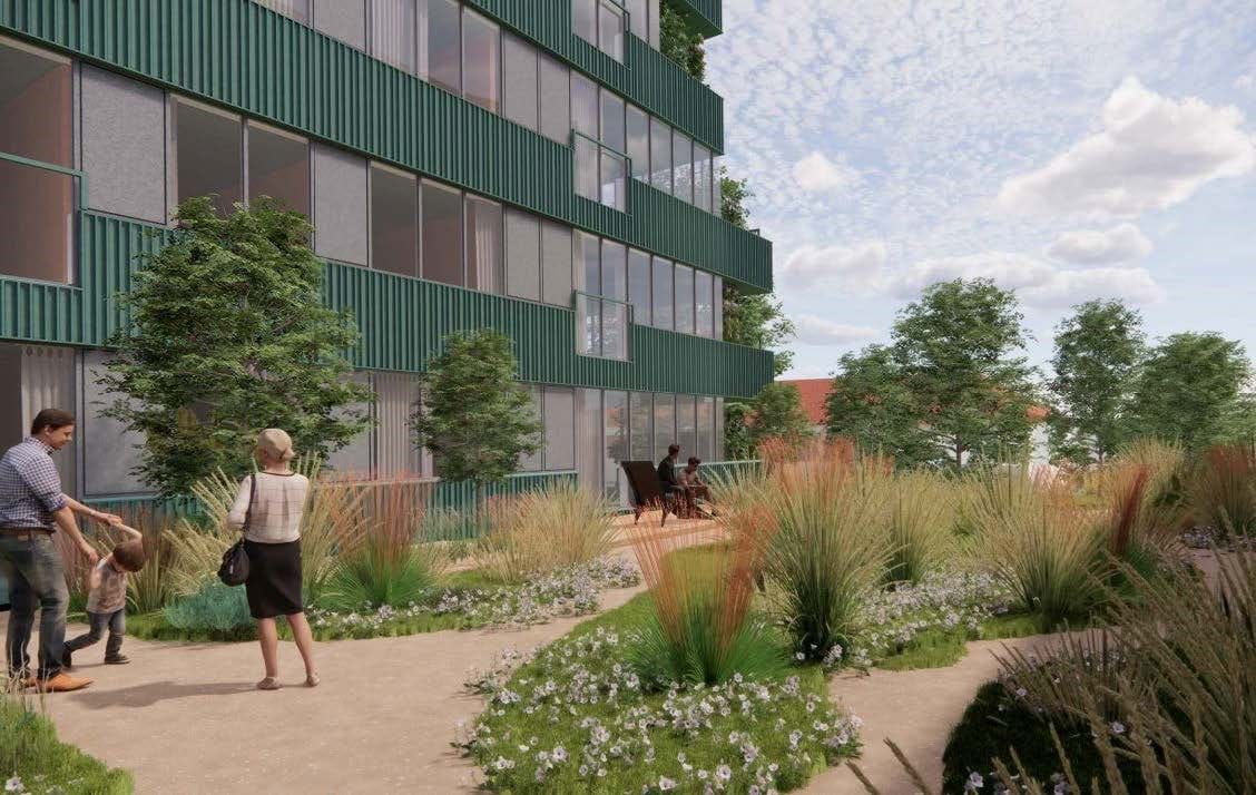 Figur 7 – Altanerne ses her på bebyggelsen. Forrest på visualiseringen er taghaven med indgangen til parkeringskælderen nedenfor.