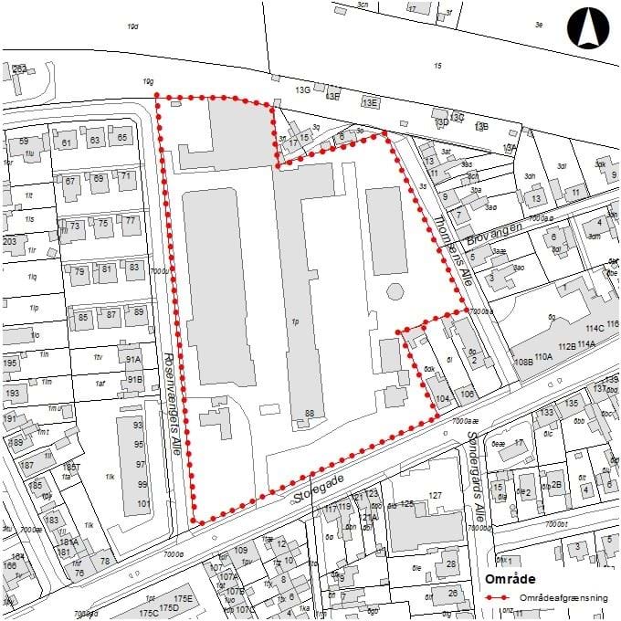 Området afgrænses mod syd af Storegade, mod vest af Rosenvængets Allé, mod øst af Thomsens Allé og mod nord af et område med kolonihaver op mod jernbanen. Udover at området afgrænses mod vej og bane, grænser lokalplanområdet også op til boliger på Storegade 104 og 106 samt op mod Thomsens Allé 2, 6, 15 og 17.