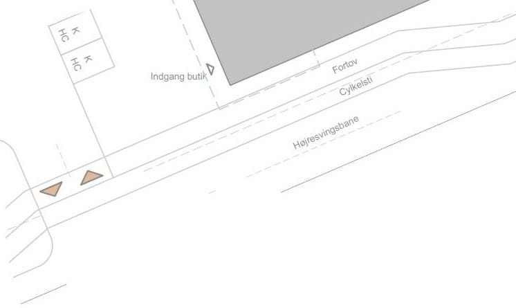 Højresvingsbanen skal etableres delvist på vejarealet og delvis ved en sideudvidelse ind i lokalplanområdet, hvorved også cykelstien og fortovet forlægges.