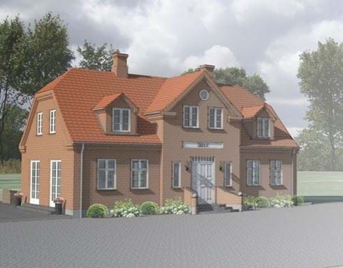 Eksempel på moderne fortolkning af et stuehus opført i tegl.