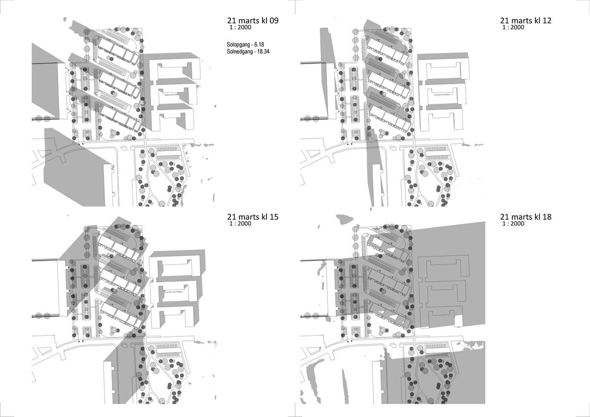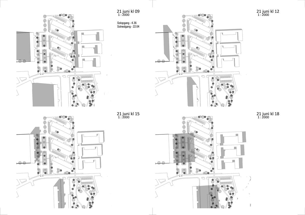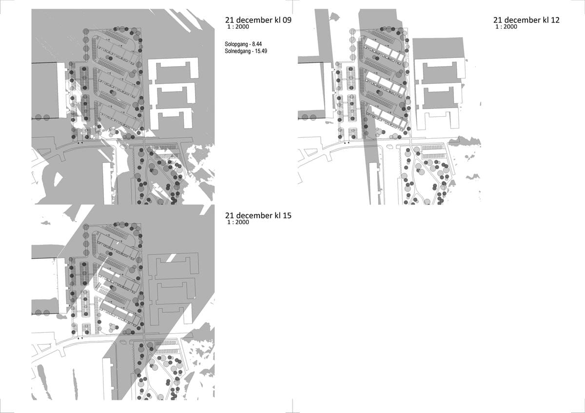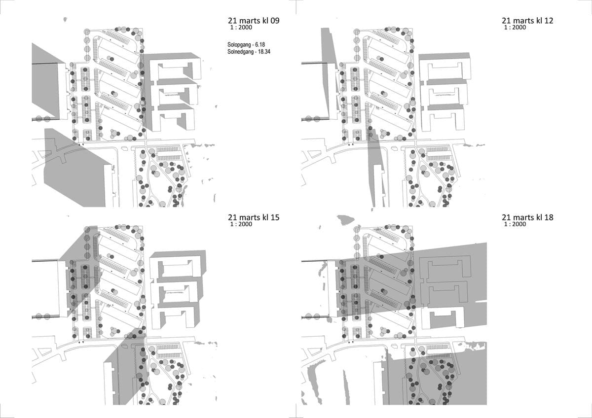 I forbindelse med lokalplanen, er der blevet fremstillet en række studier af skyggepåvirkninger. Der er udført skygge studier for området både med og uden de tre nye boligblokke. For skyggestudiet med de tre boligblokke er der for hvert byggefelt, indsat en model, repræsenterende lokalplanens maksimale bygningshøjde, for en bygning med fladt tag.