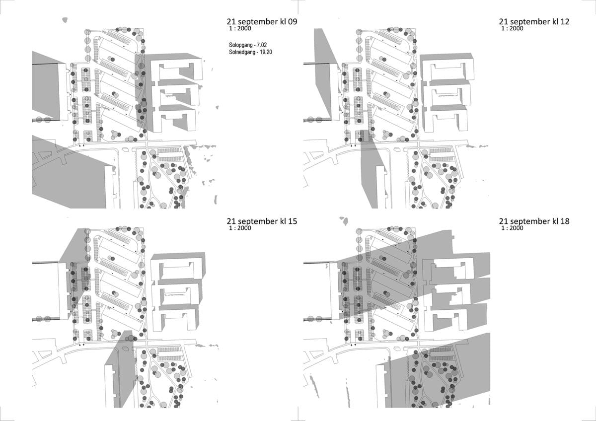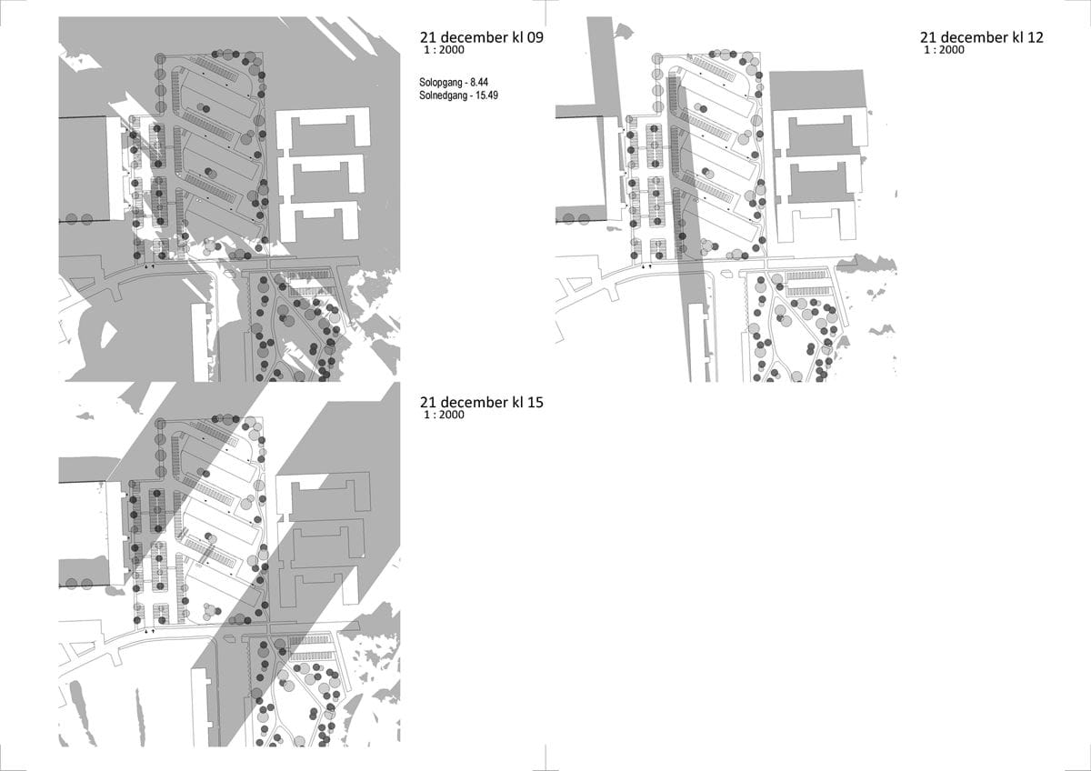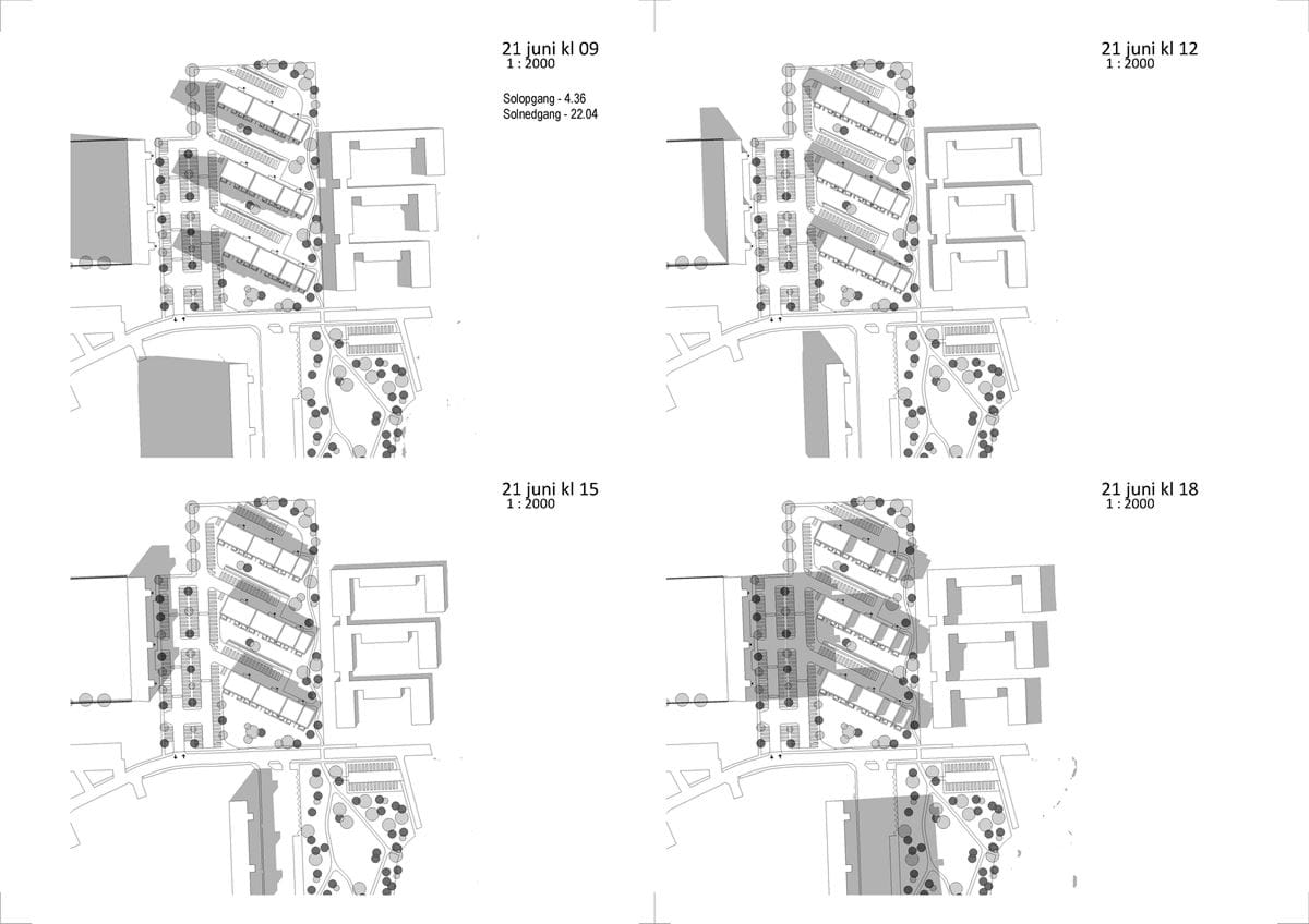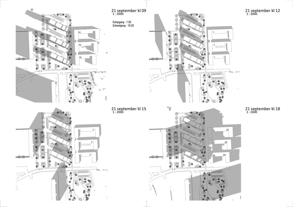 I forbindelse med lokalplanen, er der blevet fremstillet en række studier af skyggepåvirkninger. Der er udført skygge studier for området både med og uden de tre nye boligblokke. For skyggestudiet med de tre boligblokke er der for hvert byggefelt, indsat en model, repræsenterende lokalplanens maksimale bygningshøjde, for en bygning med fladt tag.