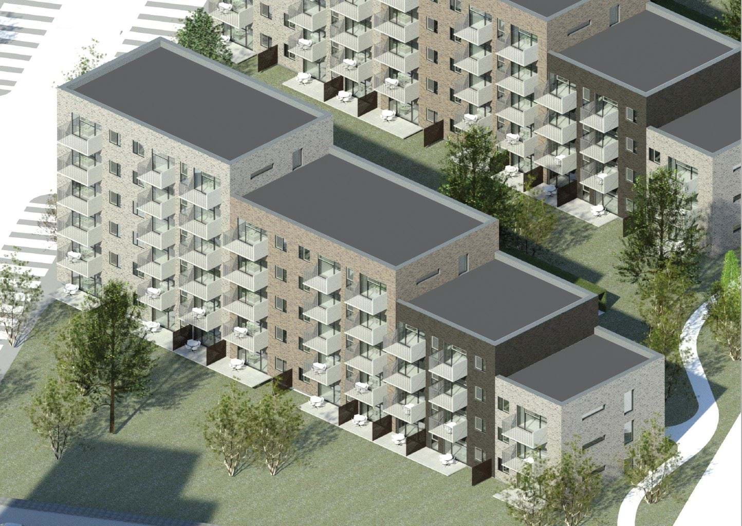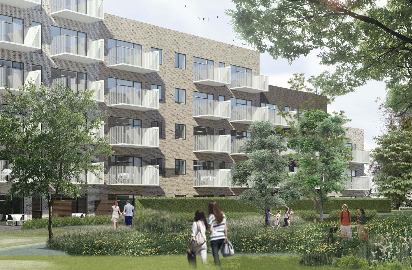 Tankerne bag de nye etageboliger er, at bygningernes volumen samt farve- og materialevalg skal indpasses i det eksisterende miljø, samtidig med at der skabes gode og attraktive opholdsarealer, hvor områdets beboere kan mødes. Imellem de tre etageboliger etableres derfor fælles haverum med opholdsarealer og stiforbindelser. Syd for etageboligerne etableres et rekreativt areal med et forsinkelsesbassin, hvor der i regnfulde perioder vil stå vand. Et grønt parkeringsareal etableres i tilknytning til bebyggelsen.