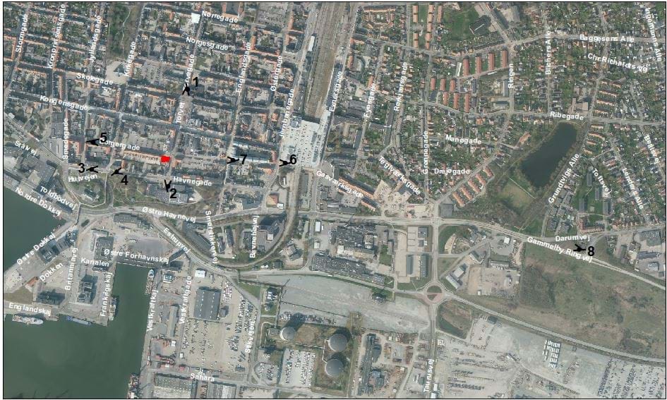 Herunder fremgår et udpluk af visualiseringerne samt overblik over fotostandpunkterne, der er anvendt for visualiseringerne. Samtlige ni visualiseringer fremgår af bilag til lokalplanen og omfatter standpunkter fra henholdsvis Fanøfærgens rute, Gammelby Ringvej, Skolegade ved Torvet, Borgergade ved Englandsgade, Borgergade ved Kirkegade, Havnegade ved Vandtårnet, Havnegade ved Torvegade, Havnegade ved Landgangen og fra parkeringsdækket over shoppingcenter Broen.
