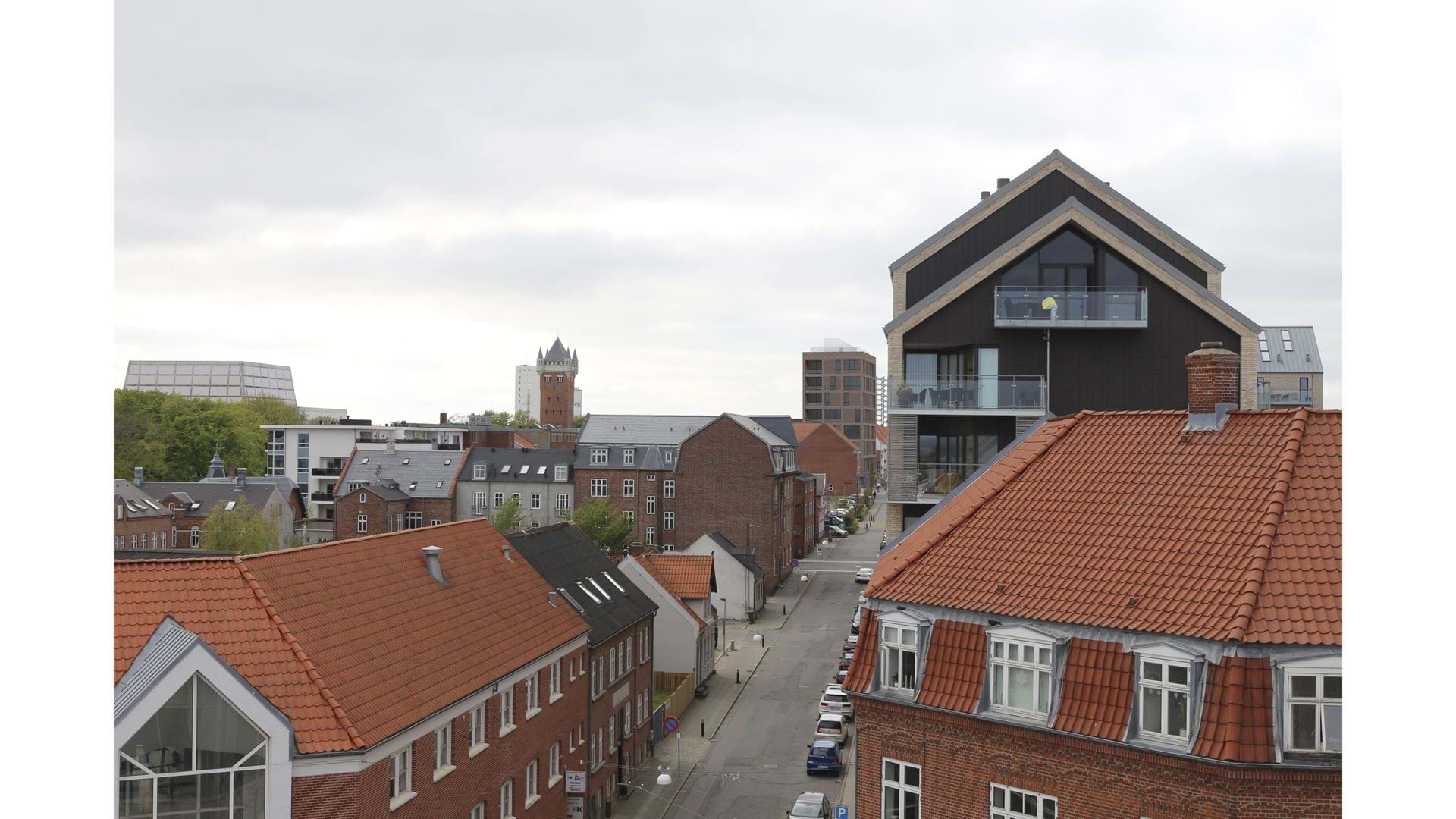 Visualisering fra P-dækket på taget af Broen shoppingcenter. Planområdet ligger til højre for Vandtårnet.