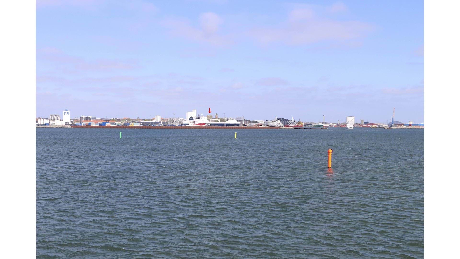 Visualisering fra Fanøfærgens rute. Planområdet ligger umiddelbart til venstre for Vandtårnet.