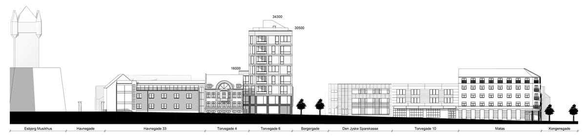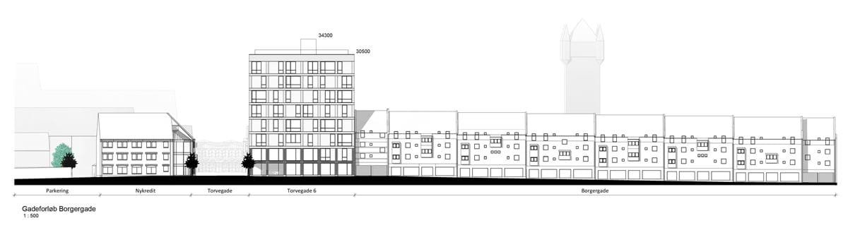 Opstalt af et projekt med et omfang, der svarer til lokalplanens muligheder. Torvegade.