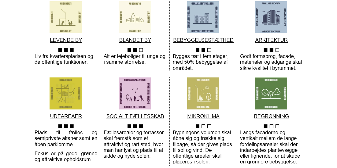 For at understøtte kvarterspladsen er der særligt fokus på, at bebyggelsesstrukturen brydes op gennem variation i etagehøjde, materialevalg, antallet af bygningsdele og et miks af offentlige funktioner i dele af facaden – samt en aktiv kantzone.
