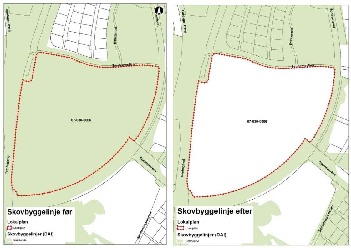 Skovbyggelinjen før og efter anmodning om ophævelse inden for planområdet.