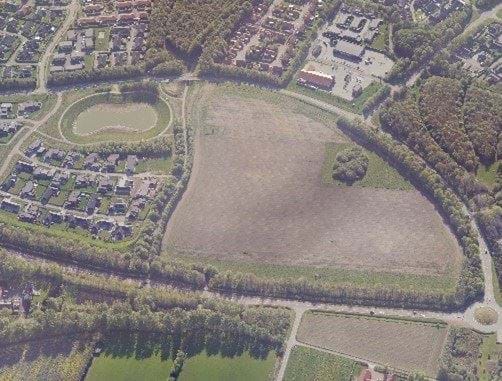 Skråfoto af planområdet set fra vest med Tarphagevej i forgrunden og lokalcenteret øverst.
