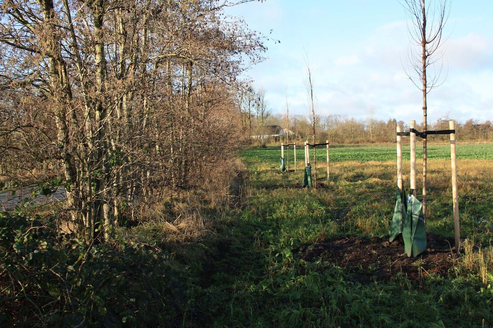 Rødelbevoksning langs med Krogsgårdsvej og nyplantede solitærtræer i det vestlige område.