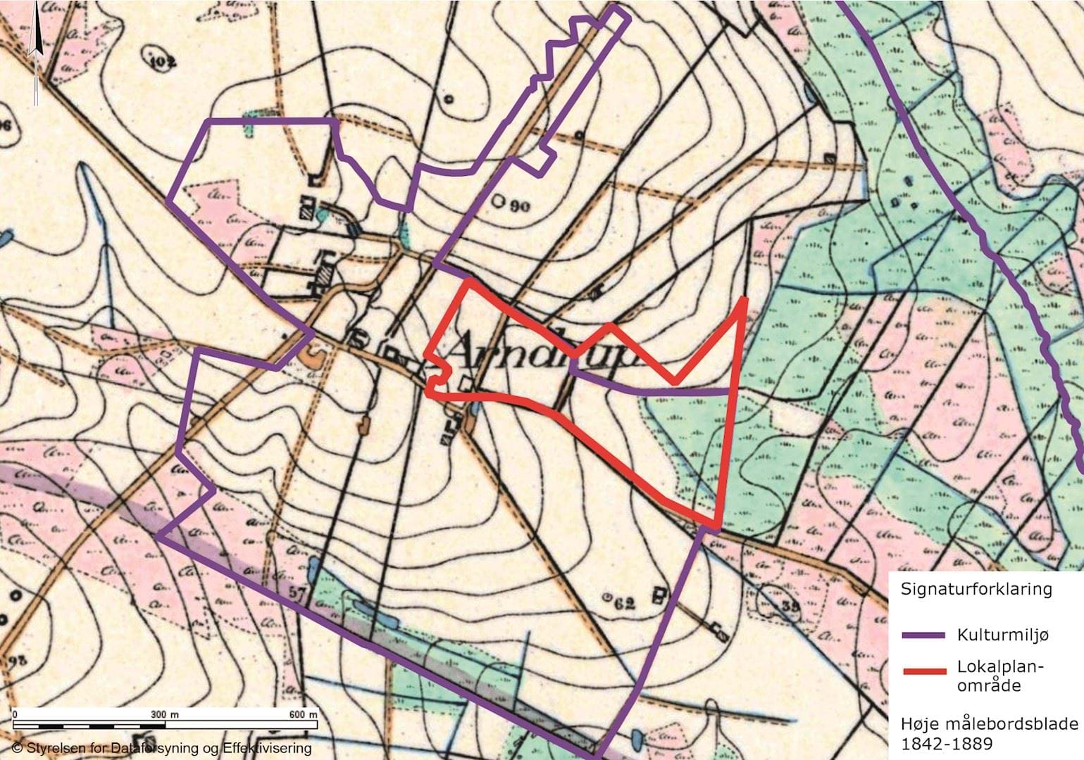 Historisk kort fra 1842-1889 viser de gårde, der eksisterede i området i 1800-tallet. Den lilla streg omkredser kulturmiljø 10.4, Andrup, og den røde streg viser lokalplanområdet.