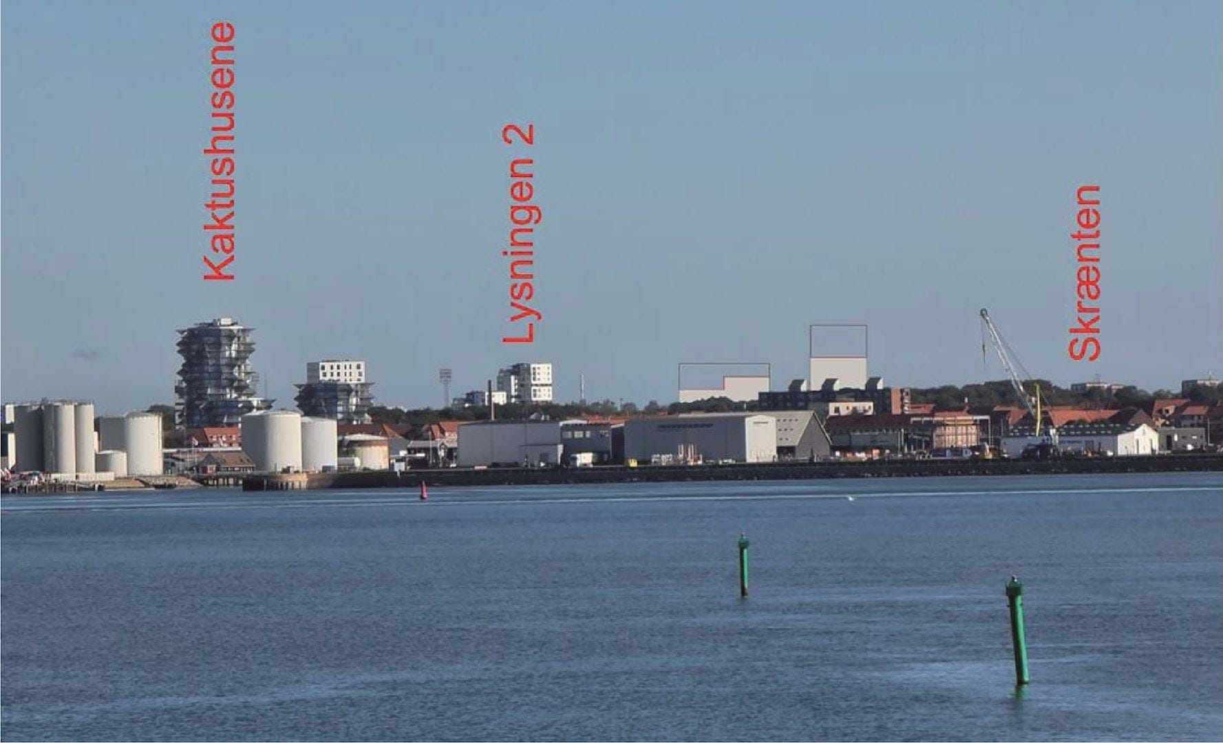 Visualisering af det planlagte højhusbyggeri set fra Fanøfærgen. Bygningernes mulige omfang er angivet med grå kasser.