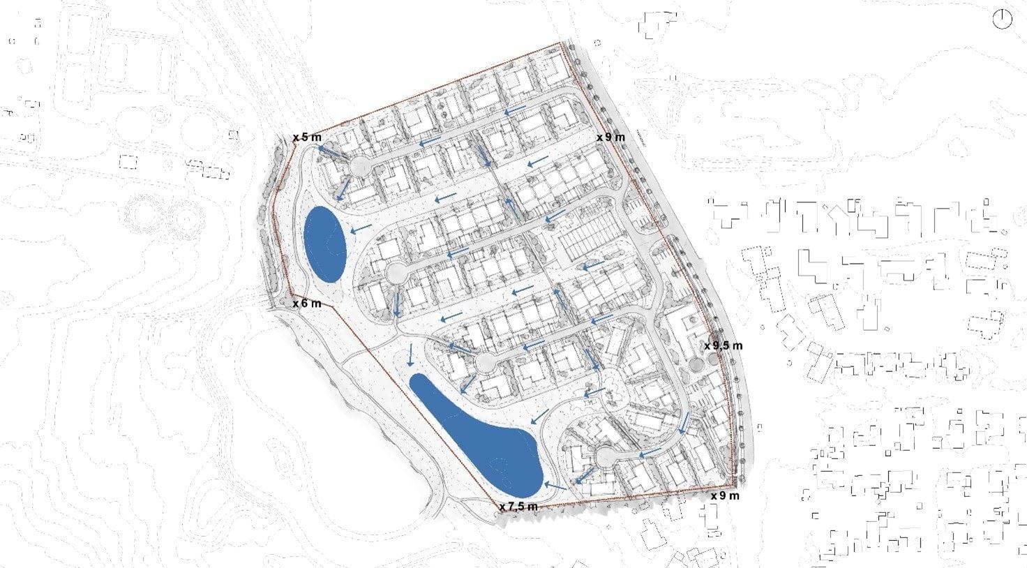 Den resterende vandmængde op til en 75-100 års regnhændelse, skal ledes til de grønne kiler og lavningerne på den vestlige del af grunden.