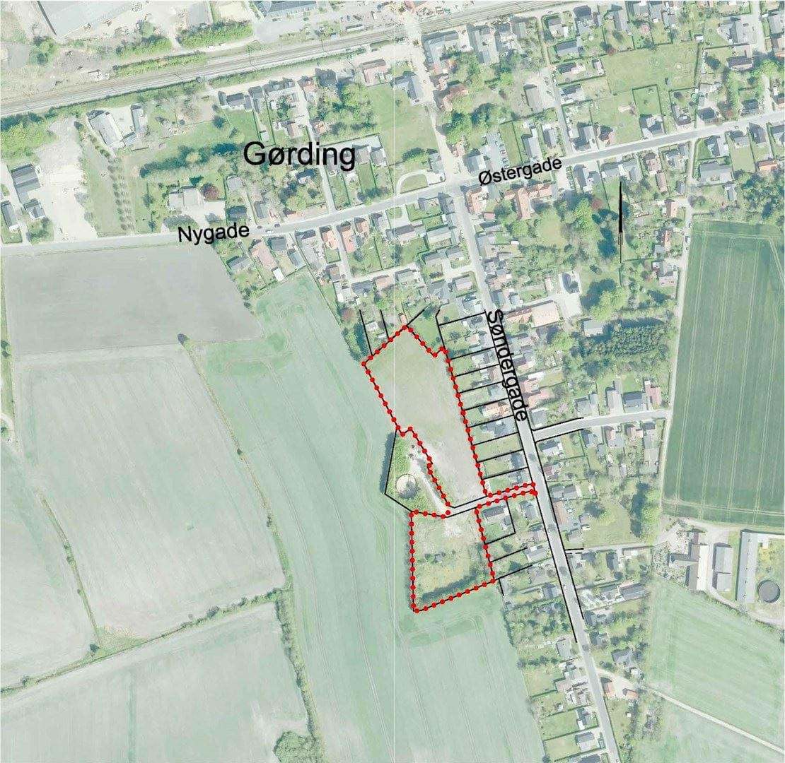 Luftfoto 2022. Lokalplanområdets placering syd for jernbanetraceet i Gørding