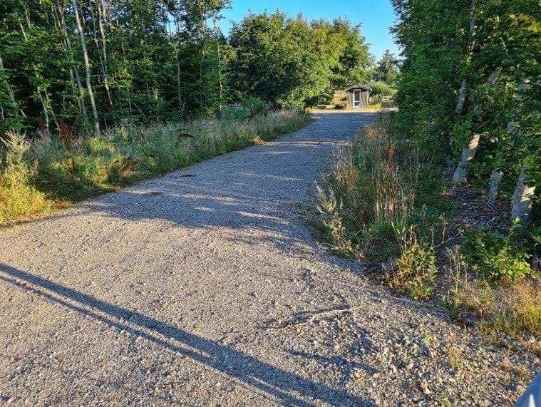 Billede fra den eksisterende asfalterede vej mod vejtilslutning til naboarealet med det spildevandtekniske anlæg som Din Forsyning råder over. Der ses en tæt randbeplantning.