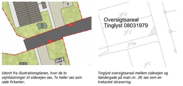 Oversigtsarealet fra sidevejen til Søndergade er sikret ved udformningen af faktiske forhold, og ved at oversigtsarealet på matr.nr. 3fc Sdr. Gørding By, Gørding er tinglyst. Sidevejen er samtidig stamvejen til boligområdet.