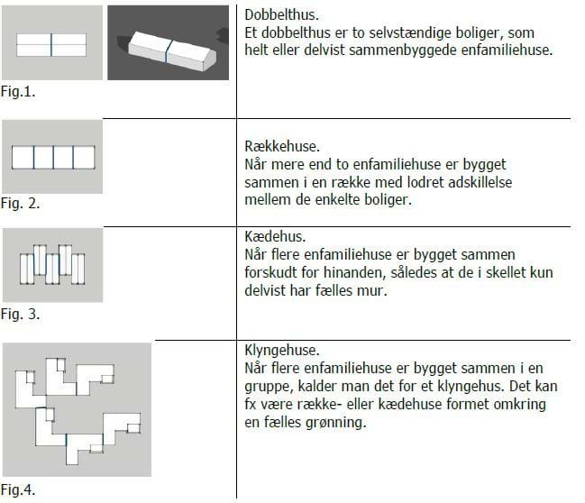 bebyggelse i form af dobbelt-, række-, klynge- eller kædehuse, se fig. 1-4 nedenfor. Der må kun opføres