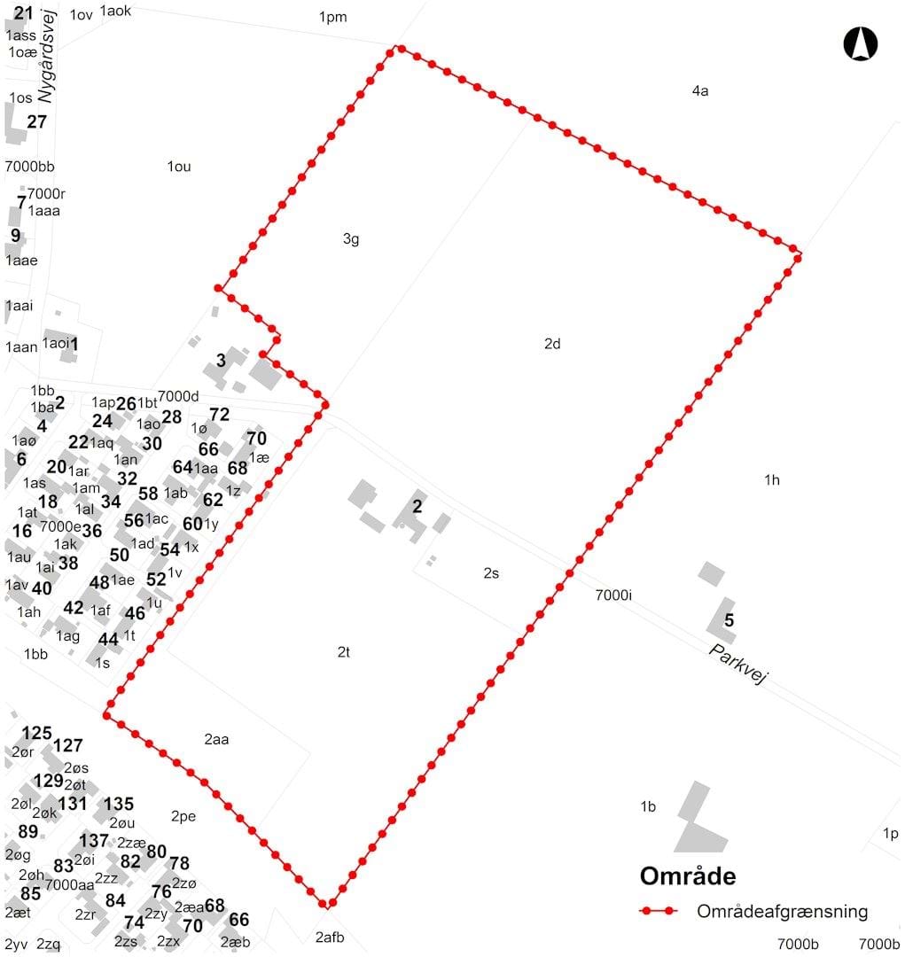 Lokalplanområdet kan ses som to dele, da Parkvej gennemskærer området. Den sydlige del af lokalplanområdet er mod vest afgrænset af et plantebælte, der ligger i det eksisterende boligområde. Mod syd er området afgrænset af Høe Bæk og mod øst et beskyttet sten- og jorddige.
