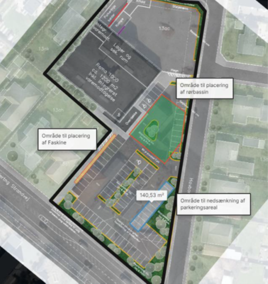 13. Foreslået placering af eventuelle faskiner, rørbassin samt nedsænket område af parkeringspladsen med henblik på at kunne tilbageholde overfladevand ved ekstrem nedbør.