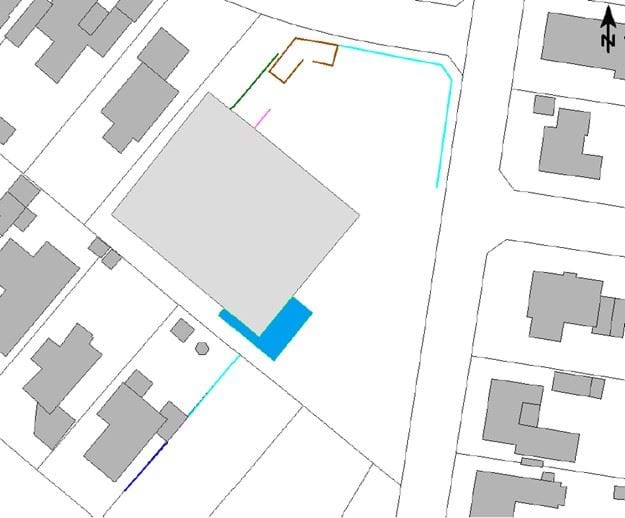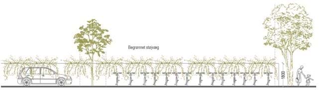 - 2,5 m høj og 15 m lang støjskærm langs den østlige side af rampen til kælderen, indikeret med den mørkegrønne linje.