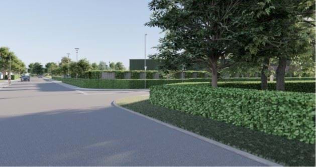 12. Visualisering ved opførelse af støjskærm på hjørnet ved Østervænget og Havborgvej. Set fra nord mod syd langs Havborgvej. Planområdet er midt i billedet.
