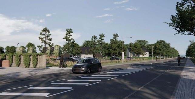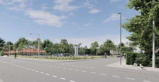 7. Visualisering fra T-krydset mellem Hjerting Strandvej og Havborgvej. På Visualiseringen fremgår det grønne udtryk med parkeringsarealet som et grønt element.