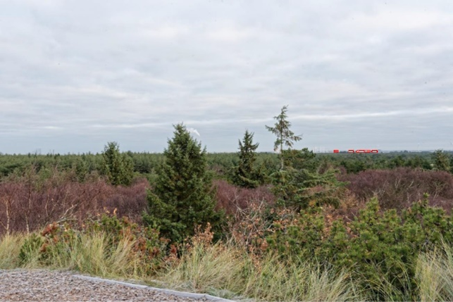 Visualiseringsbillede 3. Realisering af lokalplanen er vist med rød markering.