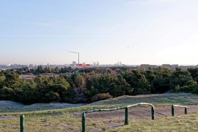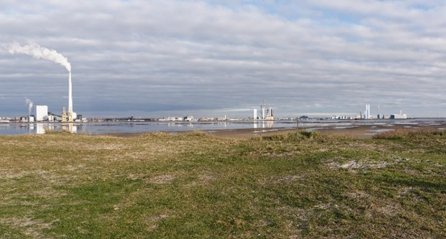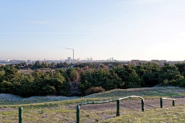Udsigt fra Kiggebjerg, Fanø, mod Esbjerg Havn. Fotostandpunkt 2 (se MV).