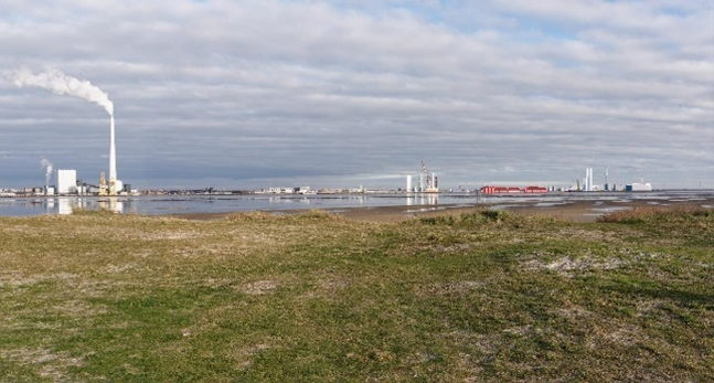 Udsigt fra Halen, Fanø mod Esbjerg Havn. Fotostandpunkt 7 (Se MV).