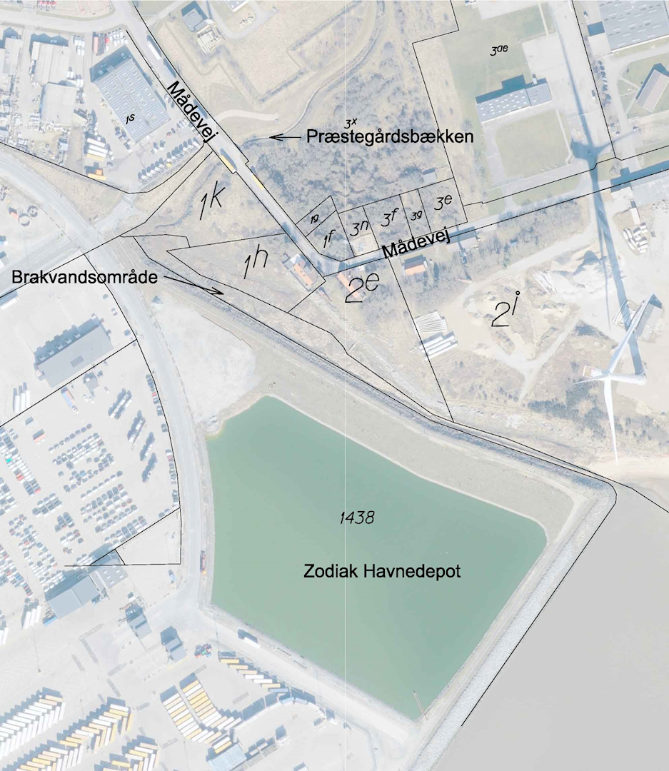 Den nordfra kommende Præstegårdsbæk løber gennem matr.nr. 1k og langs planafgrænsningen. Præstegårdsbækken er en vigtig afvandingskanal både for det separatkloakerede opland og for overløbsvand fra Renseanlæg Øst. Præstegårdsbækken har udløb til et brakvandsområde, hvortil der sker afledning af renset vand fra Zodiak Havnedepot, som er et depot til forurenet havnesediment.