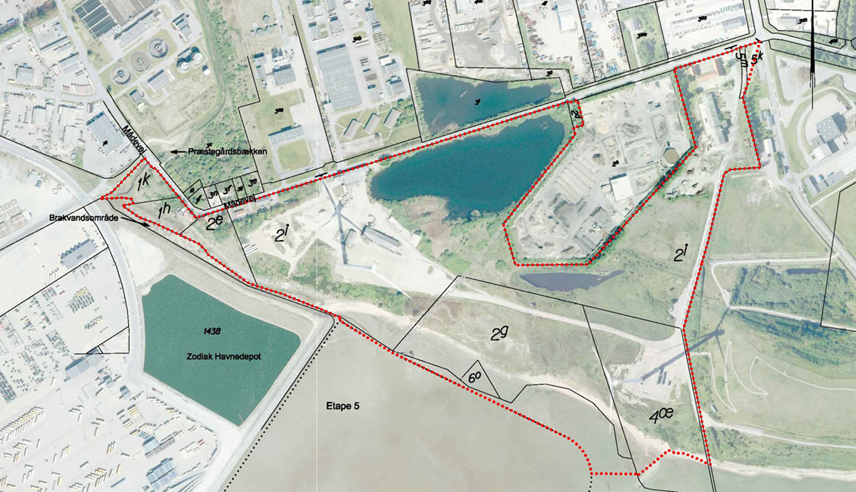 Kortet viser lokalplanafgrænsning samt grænse for udvidelse af Esbjerg Havn, etape 5.