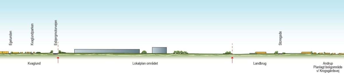 Tværsnit gennem lokalplanområdet fra Kvaglund til sydlige del af Andrup. Lokalplanområdet er stort med ca. 69 ha og mere end 1 km på tværs af området. På skitsen er indtegnet store bygningsvolumener med højder på henholdsvis 25 m og 40 m. På grund af store afstande, mellemliggende terrænforhold, samt eksisterende og ny beplantning, vil den nye bebyggelse ikke virke dominerende fra nærmeste boligområder. Afstanden fra eksisterende bebyggelse i Kvaglund til mulig ny bebyggelse i lokalplanområdet er minimum 200 meter. Afstanden til planlagt boligområde ved Krogsgårdsvej i Andrup er minimum 450 meter.