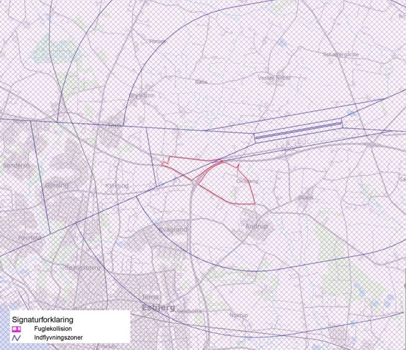 Lokalplanområdet (markeret med rød ramme) er beliggende inden for indflyvningszonen for Esbjerg Lufthavn.