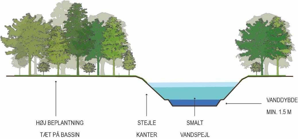 høje kanter på min. 0,5 meter og med tæt træbeplantning tæt ved bassinkanter.