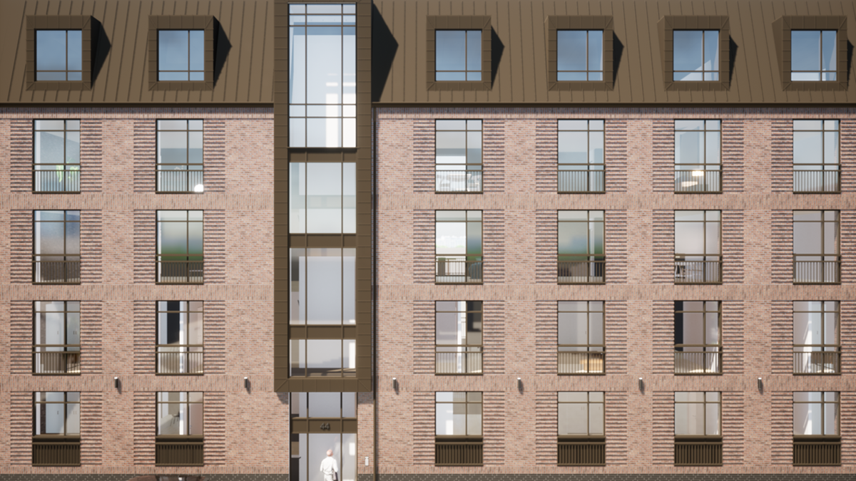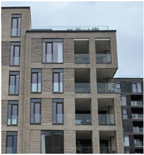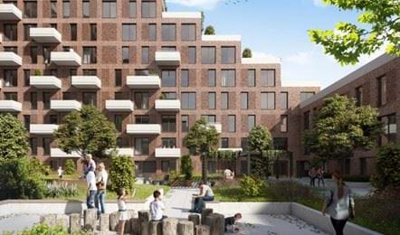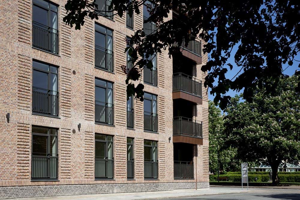 Eksempel på terrasseret byggeri i rød tegl med facadevariation. Byggeriet har en overordnet arkitektonisk vision med sit stramme grid og mange detaljer i facaden, som standerskift og recesser der giver en høj stoflighed og liv til facaden.