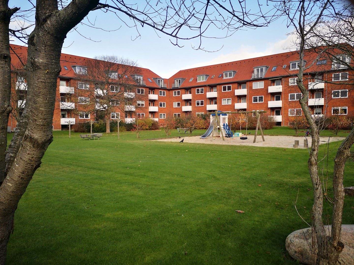 Lokalplanområdet i dag med den nærmeste eksisterende boligbebyggelse i baggrunden. Hovedparten af lokalplanområdet er i dag anvendt som græsplæne, legeplads og opholdsarealer.