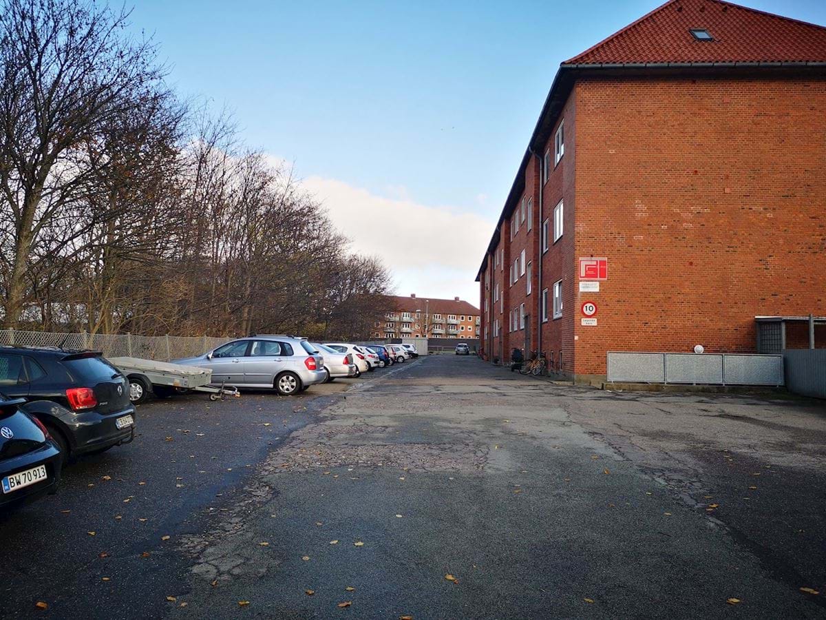 Den eksisterende boligbebyggelse og parkering, der ligger umiddelbart vest for lokalplanområdet.